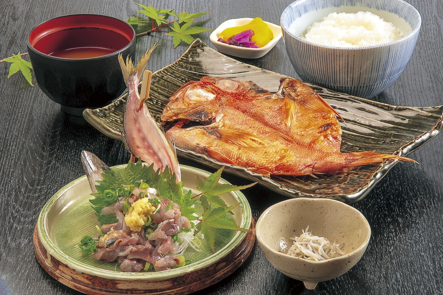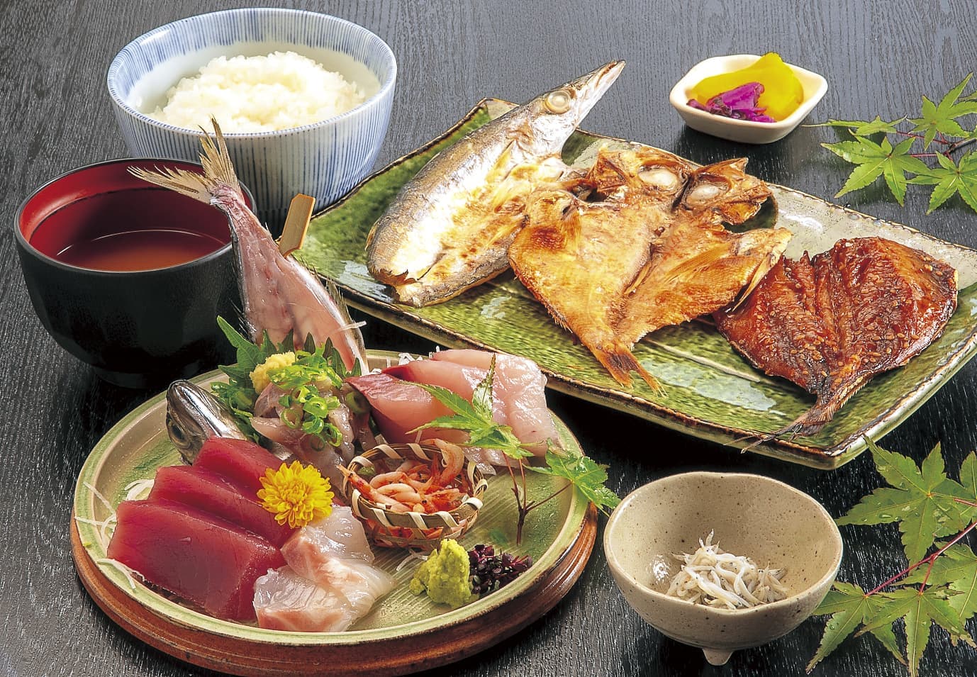 おすすめの干物と新鮮なお刺身を味わう定食です。